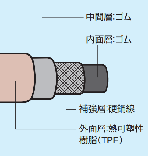 ●可とう性・腐食性・・・弾力性に優れ、踏んでも扁平化しにくいので、ガスの流れが停止することなく、ガスの立ち消えを防ぎます。